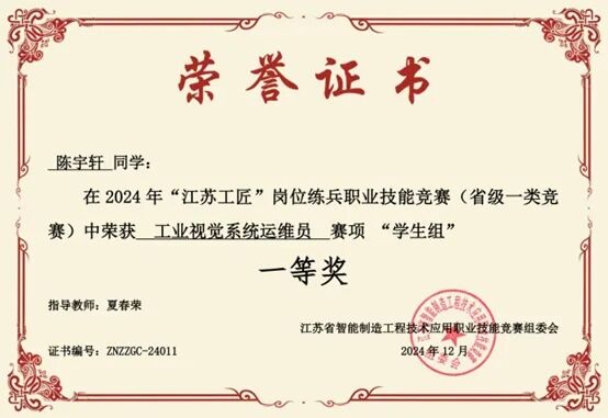 12月7日,“江蘇工匠”崗位練兵職業(yè)技能競(jìng)賽——2024年江蘇省智能制造工程技術(shù)應(yīng)用職業(yè)技能競(jìng)賽工業(yè)視覺系統(tǒng)運(yùn)維員賽項(xiàng)在常州圓滿落幕。在本次大賽中,學(xué)校機(jī)電工程學(xué)院蔡昱燦老師獲職工組一等獎(jiǎng),陳宇軒同學(xué)獲學(xué)生組一等獎(jiǎng)。