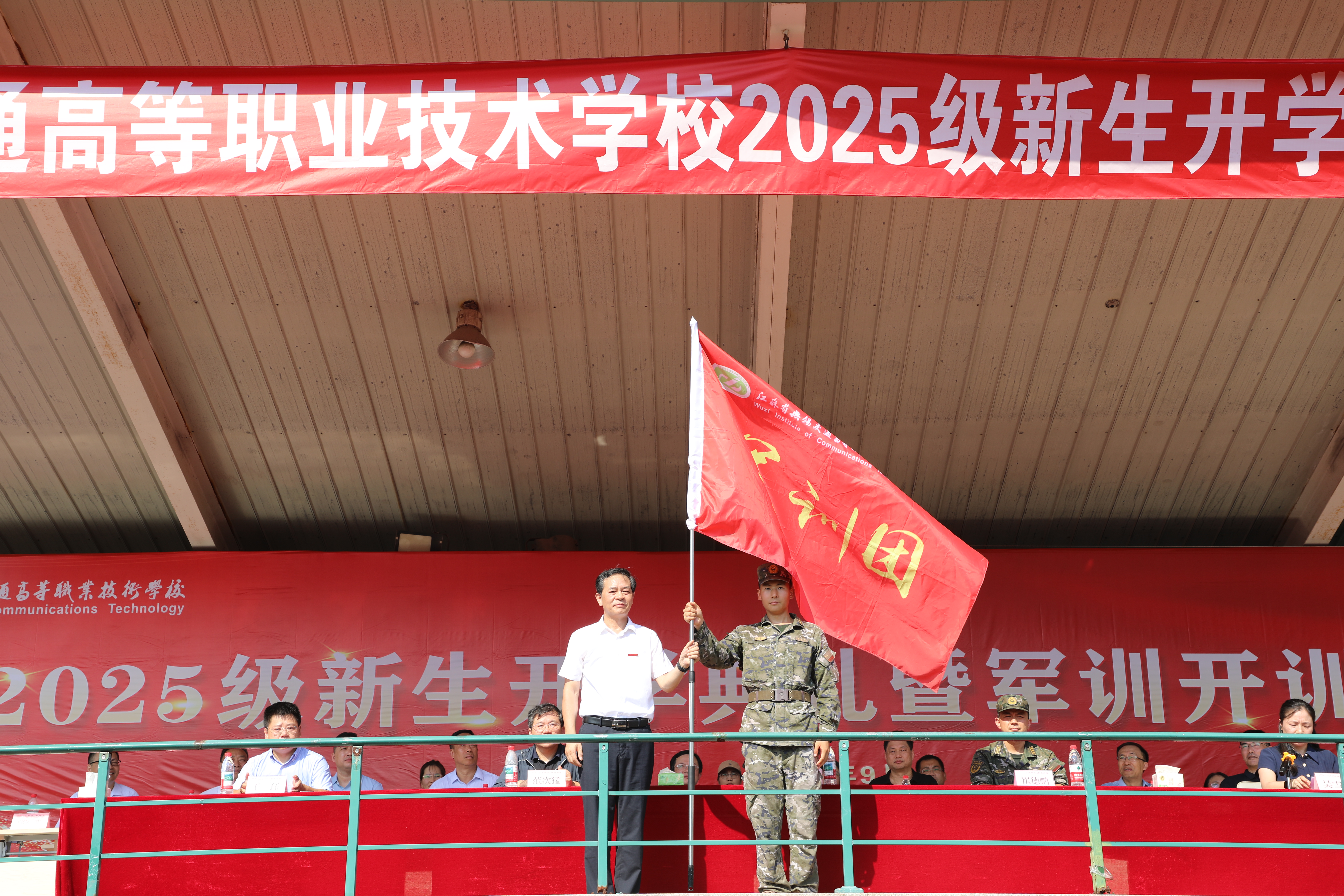 承訓(xùn)部隊教官們帶來的軍事科目展演整齊劃一、氣勢如虹,贏得了全場陣陣掌聲。耿興華校長向軍訓(xùn)總教官授予軍訓(xùn)團團旗,標(biāo)志著2025級新生軍訓(xùn)正式啟動。